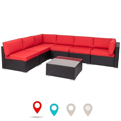 Walsunny 7pcs Outdoor Black Rattan Sectional Sofa Patio Wicker Furniture Set Conversation Sets With Tea Table Washable Couch Cushions Red